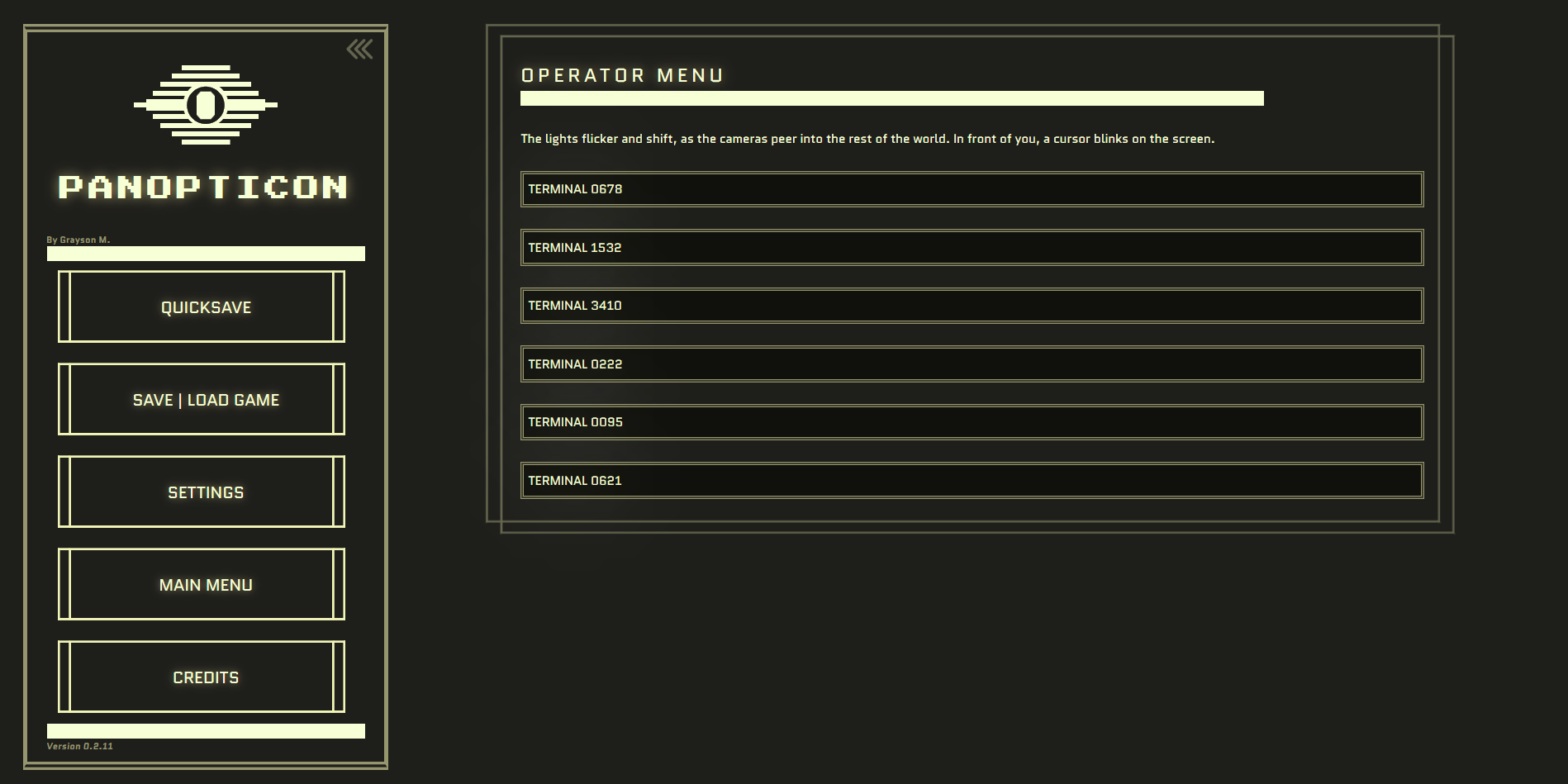 PANOPTICON is currently a work in progress. What you see here is a public demo of the first draft of the game.